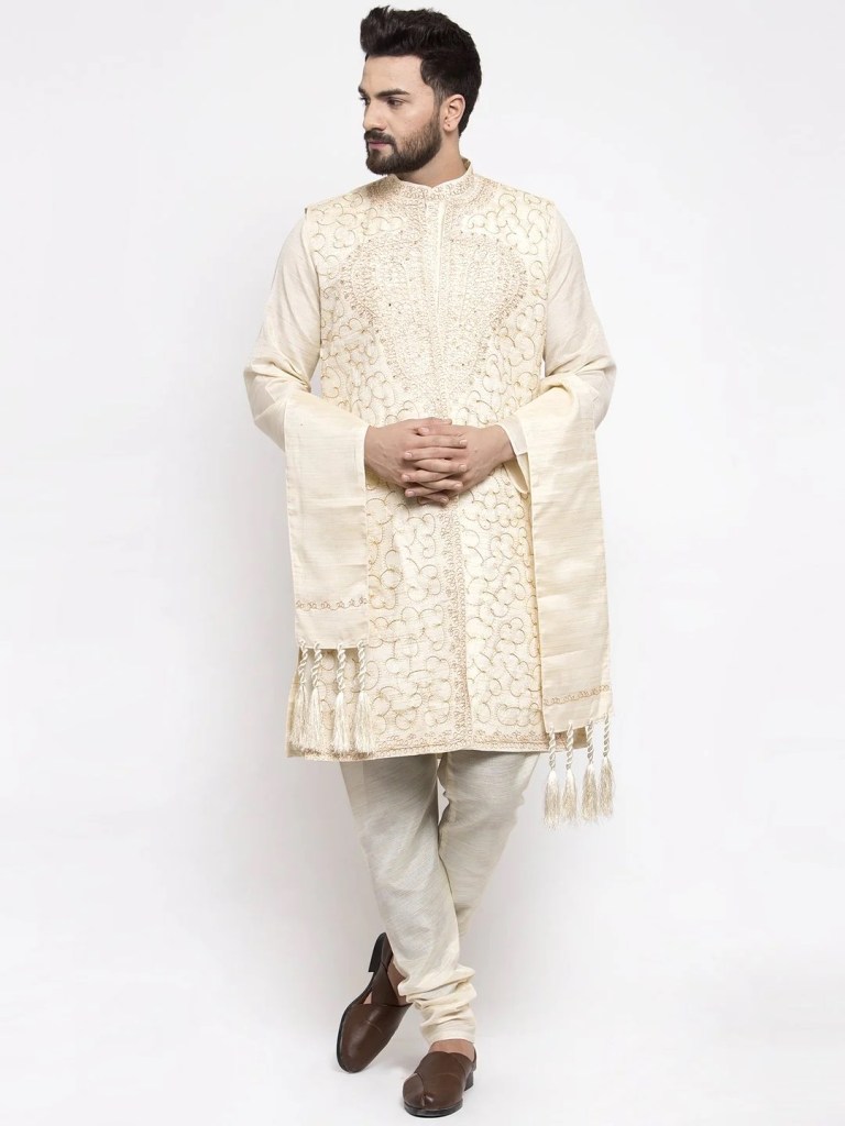 The versatility provided by kurta pajama with jacket can be used to wear for any wedding event.
